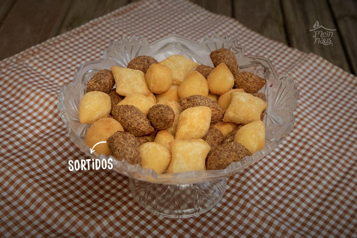 Pacote sortido com coxinha de frango, risoles de carne, quibe, croquete bacon com milho, palitinho queijo e presunto, salsicha